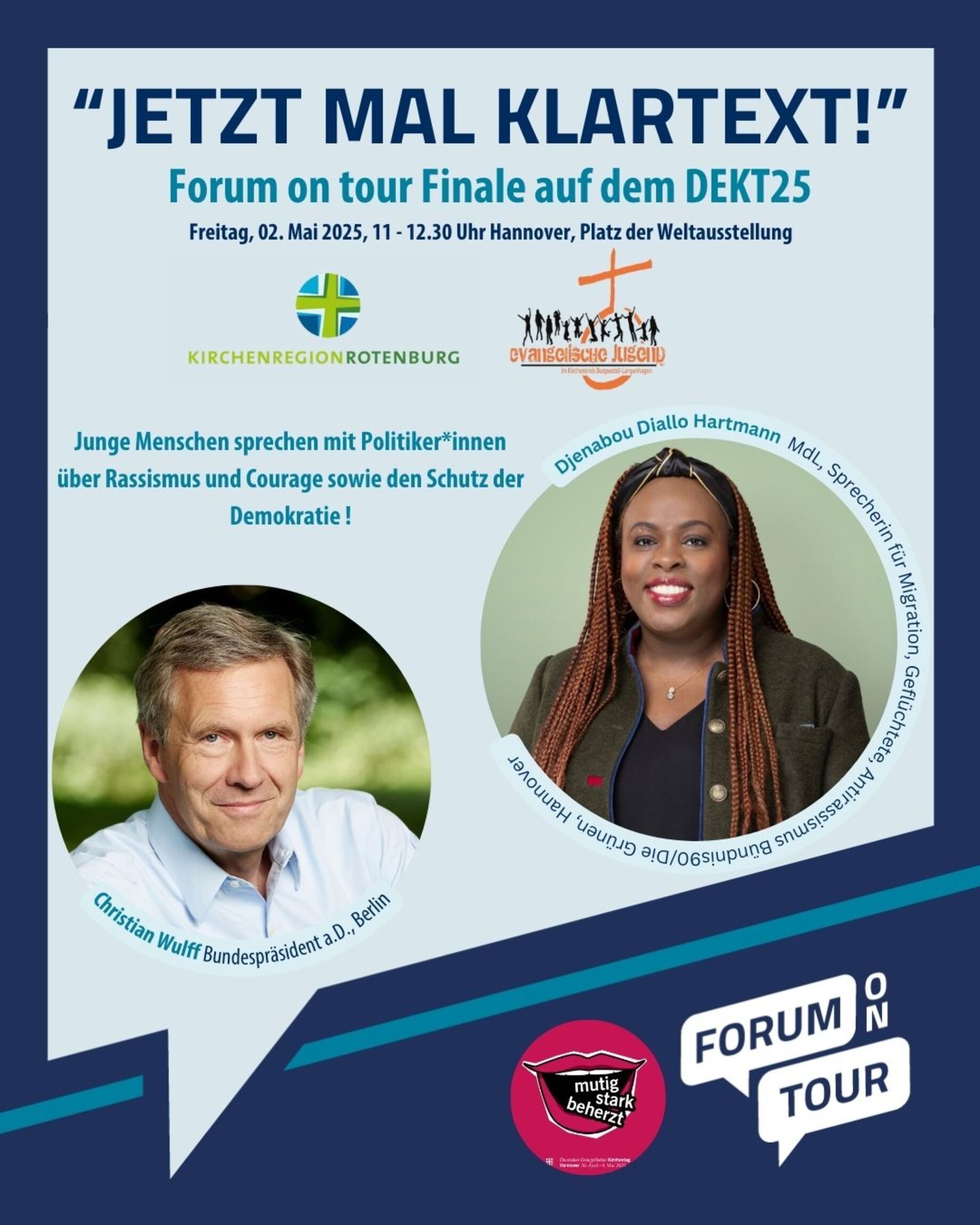 Nach mehreren spannenden Veranstaltungen findet Forum on tour mit der Veranstaltung Jetzt mal Klartext! seinen Abschluss auf dem Deutschen Evangelischen Kirchentag 2025 in Hannover. Am Freitag, 2. Mai, von 11.00 bis 12.30 Uhr auf dem Platz der Weltausstellung in der Innenstadt von Hannover werden die Jugendlichen der Ev. Jugend Burgwedel-Langenhagen und Burgdorf und der Auferstehungsgemeinde Rotenburg (Wümme) mutig, stark und beherzt die Ergebnisse ihrer Forum on tour Projekte vorstellen und ihre zentralen Themen Rassismus, kulturelle Vielfalt, Courage sowie Schutz der Demokratie diskutieren. Forum on tour ist ein gemeinsames Projekt der Hanns-Lilje-Stiftung und der Heinrich-Dammann-Stiftung.
