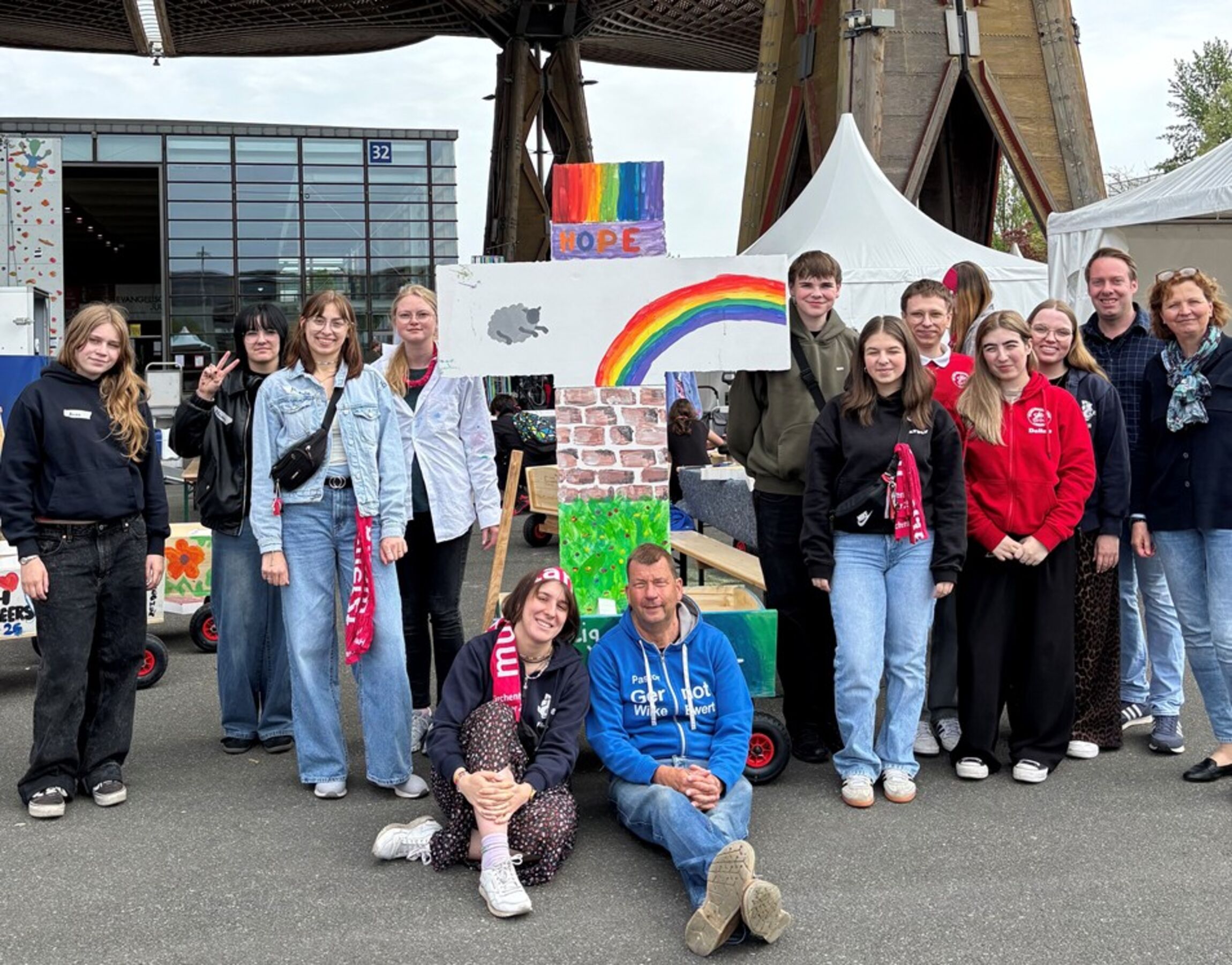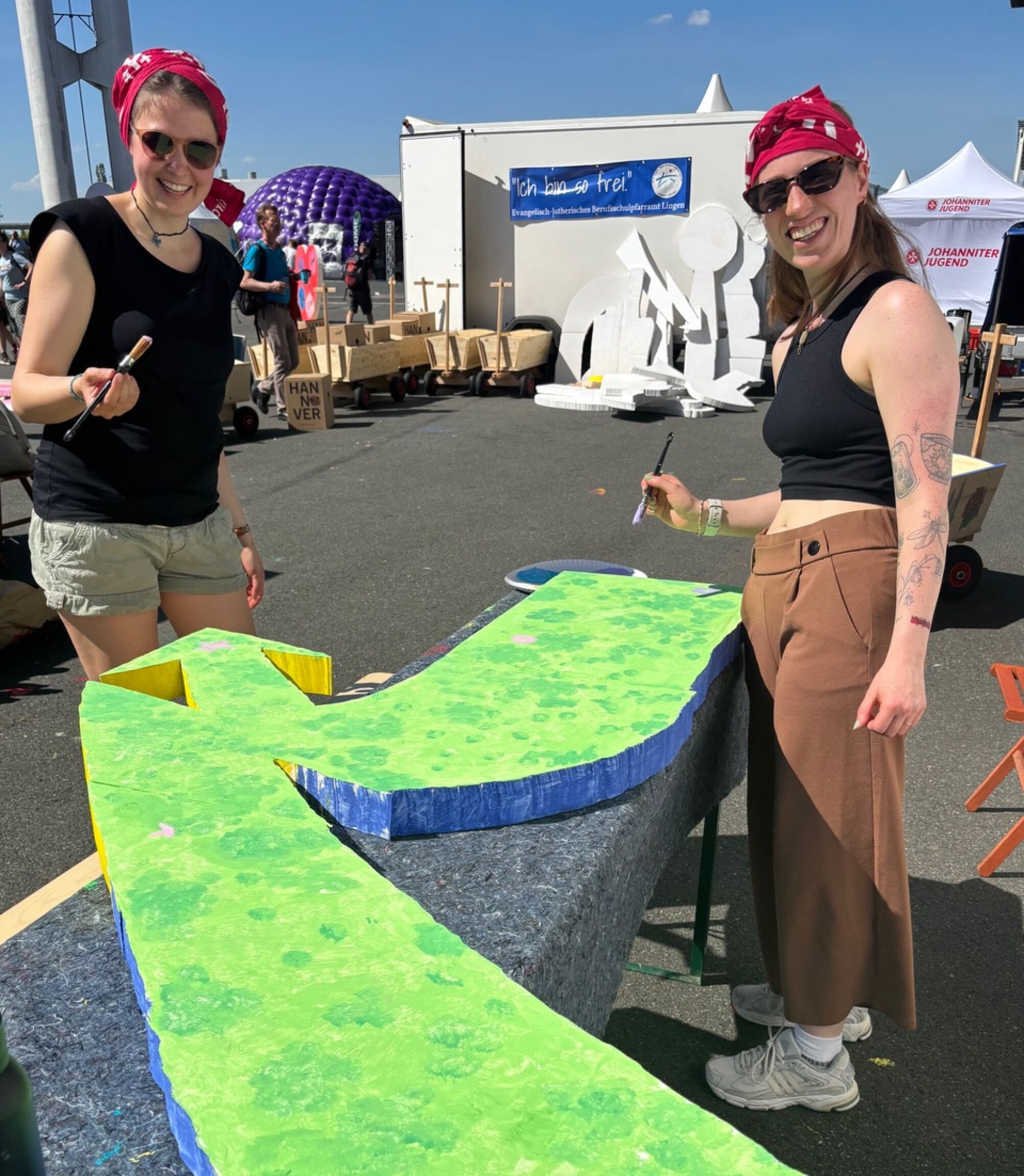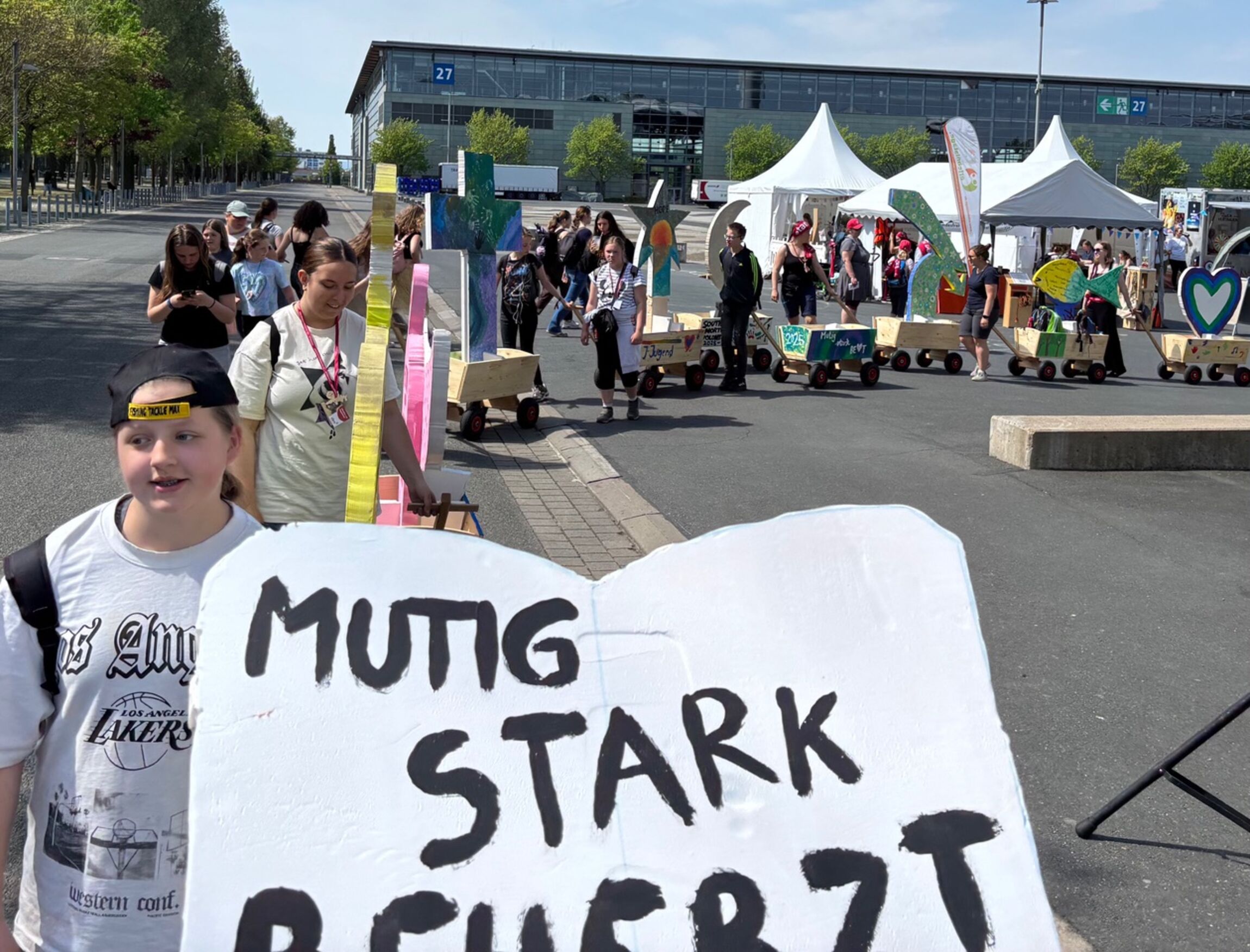 Mutig - stark - beherzt, war das Motto des Deutschen Evangelischen Kirchentages. Jugendliche haben im Bollerwagen Corso gezeigt, was sie denken, fühlen und sich so in der Öffentlichkeit präsentiert. Das kam sehr gut an, auch der NDR hat darüber berichtet. Beim Malen und Schreiben haben Jugendliche innegehalten, über sich, Gott und die Welt nachgedacht und diesen Moment gestaltet. Das war teilweise sehr berührend, Jugendliche im Gespräch zu begleiten, manchmal musste auch nur Farbe und Pinsel zur Verfügung gestellt werden. Der Stand war am Rand des Zentrums für junge Menschen aber direkt auf dem Messe Gelände und die die vorbeikommenden sahen, was möglich war und hielten an, suchten sich ein Symbol oder Bollerwagen aus und gestalteten ihre Meinung. Die Teilnehmer und Teamer zogen mit den gestalteten Bollerwagen mehrmals am Tag über den Kirchentag und auch durch die Messehallen. Ohne viel Worte kam die Botschaft bei den Kirchentagsbesuchern gut an. „Das war ein echter Hingucker und hat viel Spaß gemacht“ fassen Kirchenkreis Jugendwart Philip Krieger und Kirchentagsbeauftragter und Schulpastor Gernot Wilke-Ewert dieses Engagement zusammen. Sie hatten diese Stand-Idee, weil oft Jugendliche am 1. Mai mit Bollerwagen in die Natur ziehen und auf dem Kirchentag sollte das auch vorkommen.