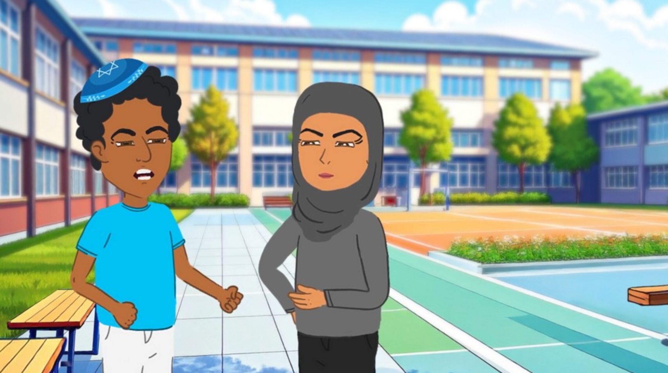 Die beiden schenken sich nichts: „Du bist ein Rassist“, wirft das Mädchen in Hijab und Turnschuhen dem Jungen vor. „Sie hat mich Jude genannt und mich für die Politik Israels verantwortlich gemacht. Das ist antisemitisch“, schwärzt der Junge mit der Kippa sie im Gegenzug bei der Lehrerin an. Zugegeben: Der Dialog auf dem Schulhof hat so nie stattgefunden. Schon deswegen zeigt er keine typische Situation, weil jüdische Schüler eine kleine und oft gar nicht sichtbare Minderheit an niedersächsischen Schulen sind. Aber wenn man Nina Käsehage eine Weile zuhört, dann merkt man: Auch wenn der Streit der beiden Zeichentrickguren erfunden ist, sind hier viele der echten Enttäuschungen, Diskriminierungserfahrungen und Vorurteile eingeossen, die sie und ihre Kollegin Hamideh Mohagheghi von Schülern gehört haben. Im Jahr 2025 haben die beiden Mitarbeiterinnen des „Hauses der Religionen” in Hannover eine Schule in Niedersachsen intensiv begleitet. Sie haben Interviews mit Schülern der Evangelischen IGS Wunstorf aus den Klassen fünf bis dreizehn geführt, ebenso wie mit Lehrern, die in ihrem Berufsalltag auf den globalen Konikt im Klassenzimmer stoßen.