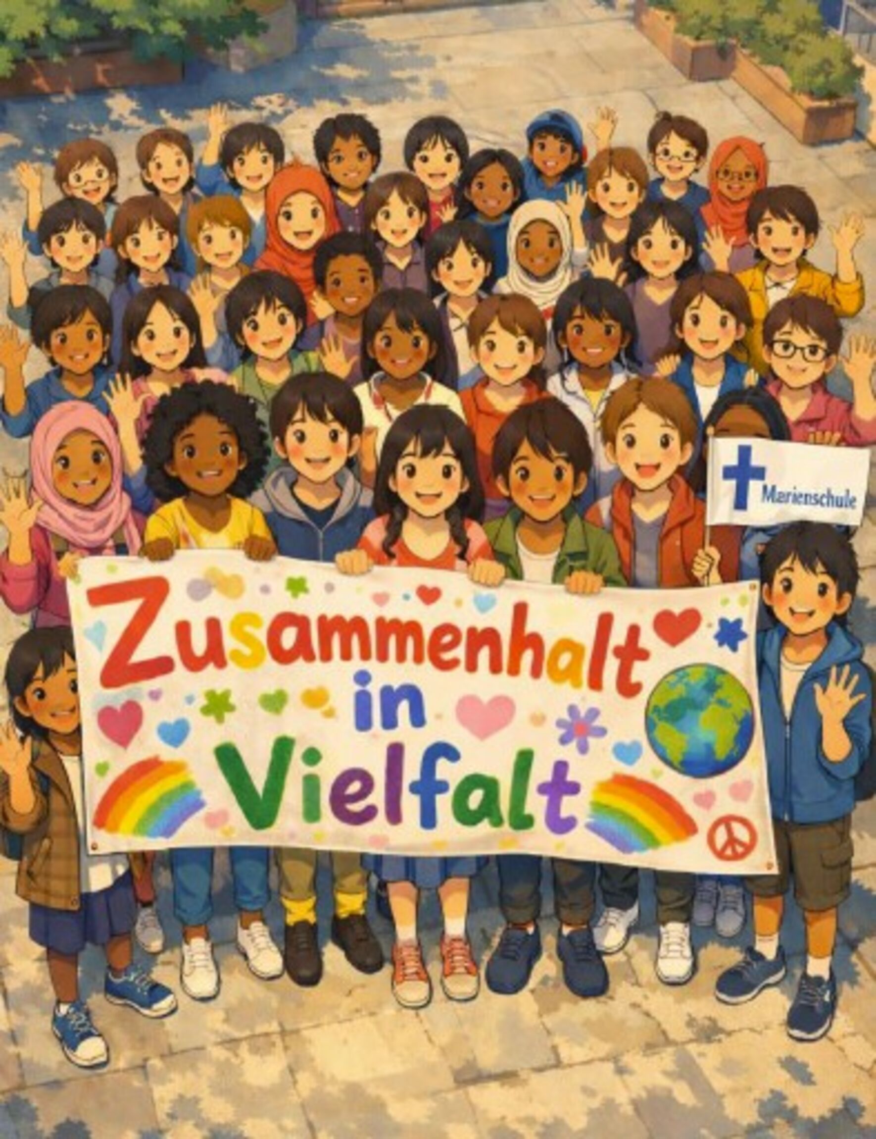 - Die Schülerinnen und Schüler können etwa ein selbst gestaltetes Banner mit dem Slogan „Zusammenhalt in Vielfalt“ hochhalten. Das Thema „Zusammenhalt in Vielfalt“ kann auch ergänzt werden, wie etwa mit: „Wir stehen zusammen“. Auch der Name der Schule sollte sichtbar sein.