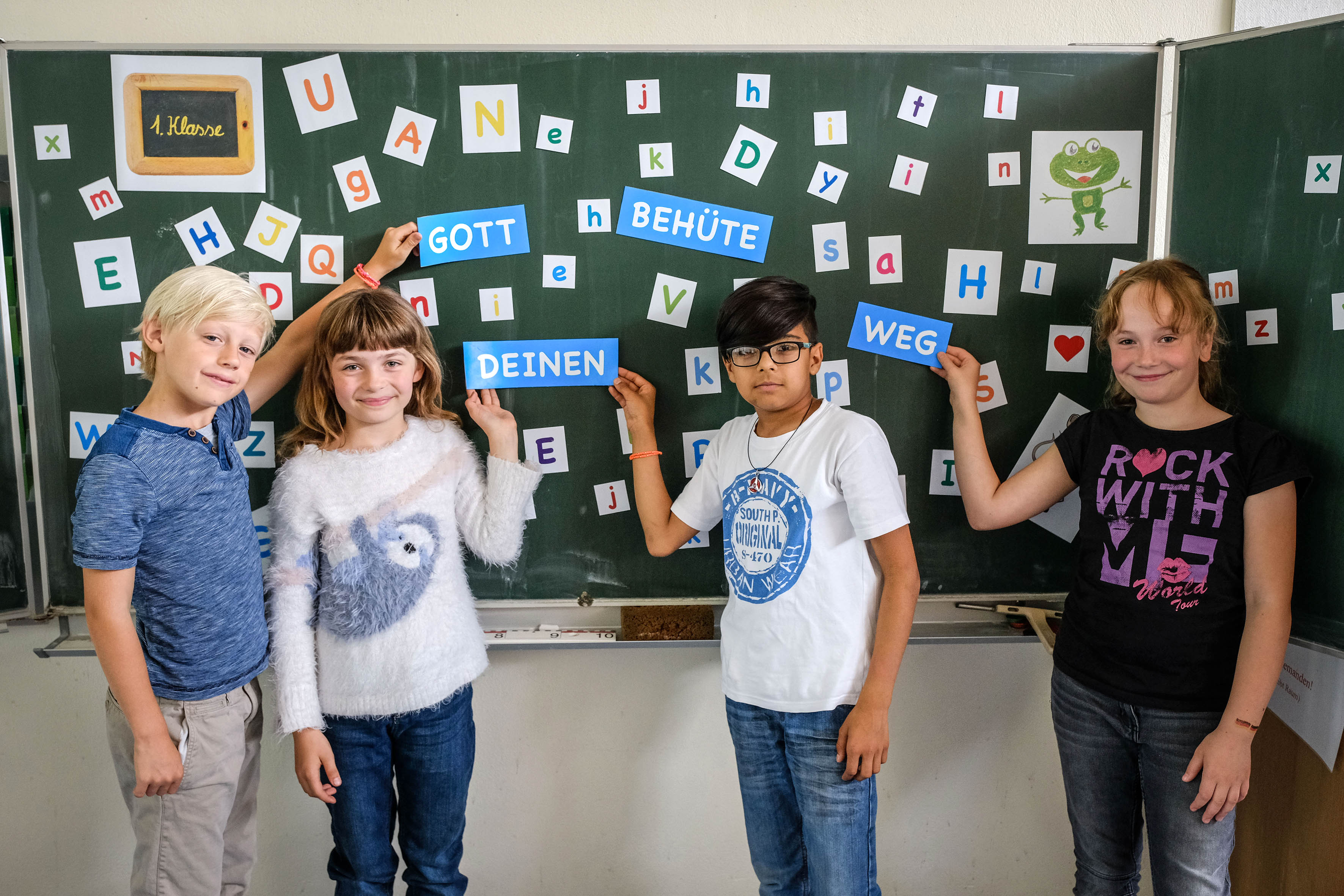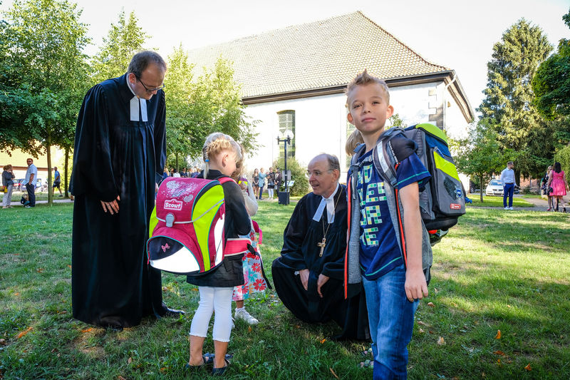 Gewusel im Altarraum, erwartungsvolle Gesichter. Vierzehn Erwachsene, davon zwei im schwarzen Talar, und zwölf Viertklässler bilden einen Kreis um gut vierzig Schulanfänger. Sie strecken die Hände über ihre Köpfe aus und sprechen zusammen: „Gott segne Dich und behüte deinen Weg. Amen“.