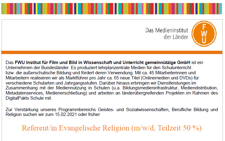 Stellenbeschreibung zum Download Referent*in für Evangelische Religion beim Medieninstitut der Länder (FWU) (PDF)
