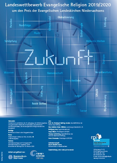 Der Landeswettbewerb Evangelische Religion findet inzwischen zum zehnten Mal statt, er wird alle zwei Jahre vom Religionspädagogischen Institut Loccum (RPI) ausgerichtet. Ins Leben gerufen wurde er 1998 gemeinsam mit der Hanns-Lilje-Stiftung; seit 2015 ist auch die Heinrich-Dammann-Stiftung an der Förderung beteiligt. Beide gehören zu den bedeutendsten evangelischen Stiftungen in Niedersachsen. Koordiniert wurde dieser Landeswettbewerb von der bisherigen RPI-Dozentin Kirsten Rabe, die damit bereits zum dritten Mal die inhaltliche Verantwortung übernimmt. „Ich freue mich sehr, dass gerade diese Prämierungsfeier das Ende meiner Zeit am RPI markiert“, sagt Rabe. „Dieser Wettbewerb lag mir immer besonders am Herzen, und ich habe ihn sehr gerne begleitet.“