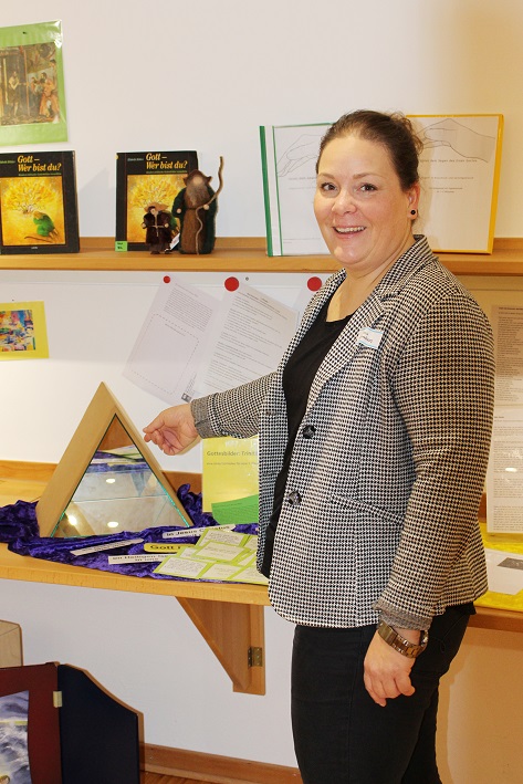 „Wir wollen die Lehrer*innen ermutigen, mit den Schüler*innen über deren Gottesbilder zu reden“, erklärt Dozentin Lena Sonnenburg, die die Ausstellung gemeinsam mit ihrem Lernwerkstatt-Team vorbereitet hat. „Gott ist eben nicht immer nur der liebe Vater im Himmel, sondern es gibt ganz vielfältige Arten von Gott zu sprechen und ganz unterschiedliche Symbole, um Gott darzustellen. Uns war es wichtig, den Kolleg*innen Hilfestellung dazu zu geben, wie man die eigenen Bilder von Gott weiten kann!“