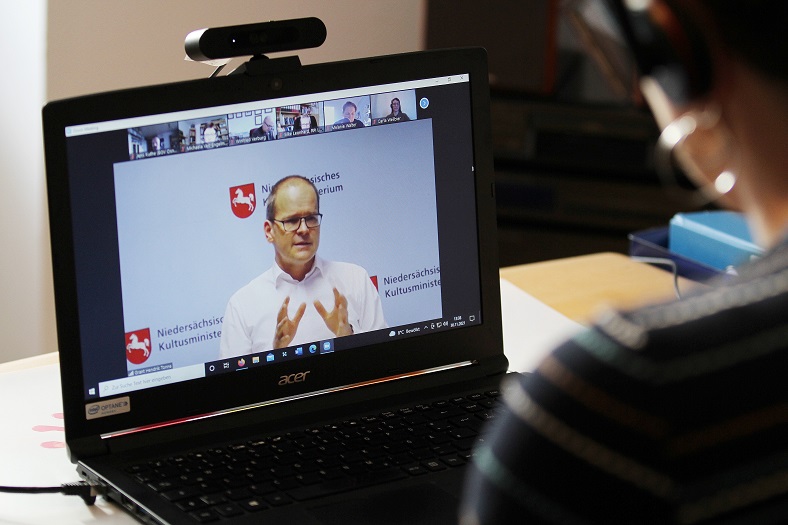 Einen Fokus legte der Minister auf den Distanzunterricht, also einen Unterricht, bei dem Schüler*innen vor den heimischen Rechnern sitzen und nicht im Klassenzimmer. Hier betonte Tonne: „Distanzunterricht ist ein Baustein, ein breites Ausbildungsangebot in der Fläche zu erhalten.“ Denn in einem Flächenland wie Niedersachsen sei eine ortsunabhängige Beschulung wichtig, besonders für seltene Ausbildungsberufe, die nur an wenigen Berufsbildenden Schulen angeboten werden. Hier habe Niedersachsen bereits wichtige Grundlagen gelegt.