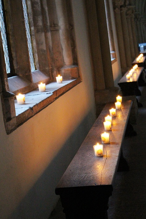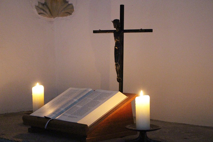 Schweigend betreten die angehenden Religionslehrkräfte die Klosterkirche, jede und jeder mit einer brennenden Kerze in der Hand. Leise und andächtig erkunden sie den Kirchenraum, bis alle ihren persönlichen Lieblingsort gefunden haben. „Mich hat gleich dieses Fenster hier im Chorraum angezogen“, sagt eine Teilnehmerin. Sie steht davor und blickt auf das bunte Fensterglas, durch das ein letzter Rest abendlicher Helligkeit fällt. Andere sitzen in den Stuhlreihen oder sogar auf dem Boden oder stehen vor dem Altar. Später liegen alle auf Matten in der Vierung und betrachten die Kirchendecke. „Ein bisschen, als ob wir Yoga machen würden“, sagt jemand und schmunzelt.